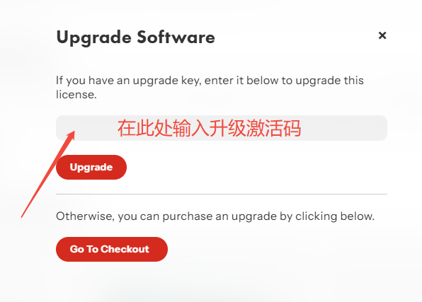 5.点击升级会弹出升级验证窗口,我们只需要在此处输入升级激活码,然后点击升级(Upgrade)按钮即可完成升级。购买后不知道如何获取升级序列号?点此查看。。